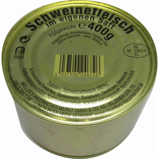 Zutatenverzeichnis: Schweinefleisch (95%), Schweineschwarten, Speisesalz, Zwiebeln, Dextrose, Gewürze, Antioxidationsmittel: Natriumascorbat, Konservierungsstoff: Natriumnitrit