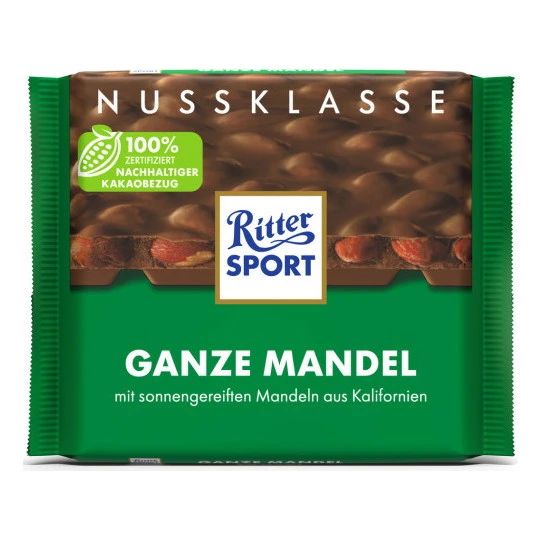 Mit der Ritter Sport Ganze Mandel holst du dir ein sonniges Gefühl direkt in deinen Bauch! Denn die leckeren Mandeln sind nicht nur knackig geröstet, sondern zuvor auch lange Zeit unter der kalifornischen Sonne gereift. Umhüllt von klassischer Vollmilchschokolade entsteht so eine Kombination, bei der es einem ganz warm ums Herz wird. Eine echte Mandelikatesse eben.